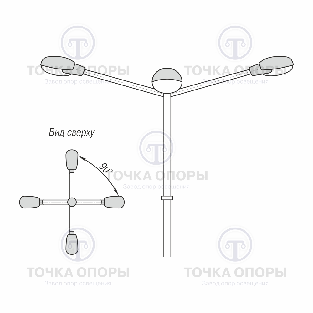 Конструктивно развороты кронштейнов К4-1,5-1,0-/90-Ф4 исполняются по схеме «4 рожка под углом 90 градусов». При этом угол разворота между рожками в вертикальной плоскости имеет диапазон от 0° до 180°, в связи с чем расположение светильников у четырехрожковых кронштейнов может иметь любую вариантность.